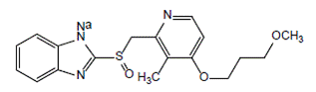 Rabeprazole sodium, which is a proton pump inhibitor. It is a substituted benzimidazole known chemically as 2-[[[4-(3-methoxypropoxy)-3-methyl-2-pyridinyl]-methyl]sulfinyl]-1H–benzimidazole sodium salt. It has an empirical formula of C18H20N3NaO3S and a molecular weight of 381.42. Rabeprazole sodium is a white to slightly yellowish-white solid. It is very soluble in water and methanol, freely soluble in ethanol, chloroform, and ethyl acetate and insoluble in ether and n-hexane. The stability of rabeprazole sodium is a function of pH; it is rapidly degraded in acid media, and is more stable under alkaline conditions. The structural Formula is: