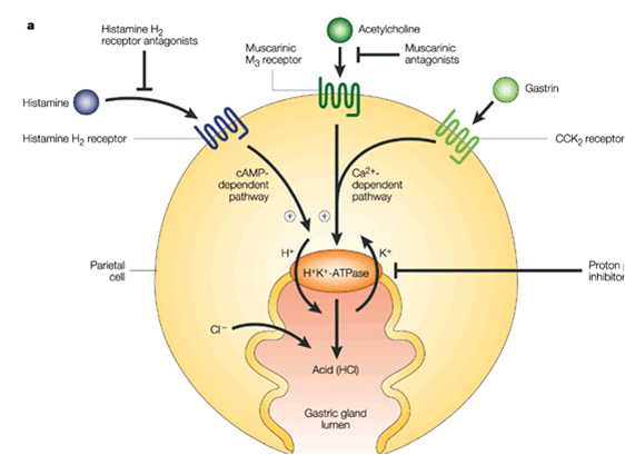 Gastric acid is secreted by parietal cells of the stomach in response to stimuli such as the presence of food in the stomach or intestine and the taste, smell, sight or thought of food. Such stimuli result in the activation of histamine, acetylcholine or gastrin receptors (the H2, M3 and CCK2 receptors, respectively) located in the basolateral membrane of the parietal cell, which initiates signal transduction pathways that converge on the activation of the H+K+-ATPase â€" the final step of acid secretion. Inhibition of this proton pump has the advantage that it will reduce acid secretion independently of how secretion is stimulated, in contrast to other pharmacological approaches to the regulation of acid secretion; for example, the inhibition of acid secretion by H2 receptor antagonists can be overcome by food-induced stimulation of acid secretion via gastrin or acetylcholine receptors. Proton-pump inhibitors such as omeprazole are prodrugs that are converted to their active form in acidic environments. Omeprazole is a weak base, and so specifically concentrates in the acidic secretory canaliculi of the parietal cell, where it is activated by a proton-catalysed process to generate a sulphenamide. The sulphenamide interacts covalently with the sulphydryl groups of cysteine residues in the extracellular domain of the H+K+-ATPase â€" in particular Cys 813 â€" thereby inhibiting its activity. The specific concentration of proton-pump inhibitors such as omeprazole in the secretory canaliculi of the parietal cell is reflected in their favourable side-effect profile.