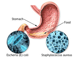 - Escherichia col -E. coli, are bacteria found in the digestive systems of many animals, including humans. Most strains are harmless but some can cause serious illness. E.coli poisoning occurs after eating undercooked beef or drinking unpasteurized milk