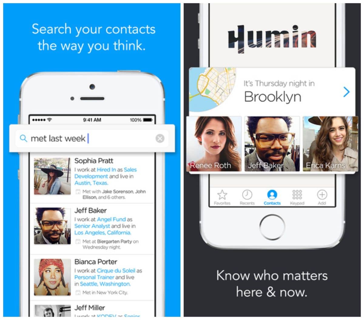 Ask any entrepreneur: He or she will tell you that the essence of business success lies in making the right connections -- whether they be for potential new business, partnerships or that next round of funding. Entrepreneurs are constantly networking and conducting meetings, but it can be almost impossible to keep track of how and where you met someone. Humin handles all of that for you. When you insert information into the app, it remembers all of the tiny details of how and where you met someone, allowing you to actually be in the moment instead of trying to remember information later. Humin solves this problem by combining your contacts, dialing and voice mailbox to calculate who your most important contacts are.